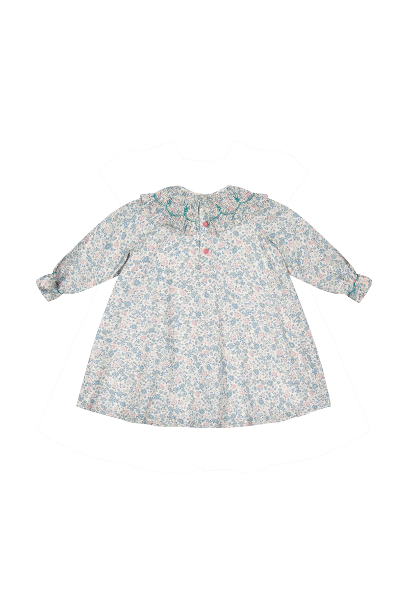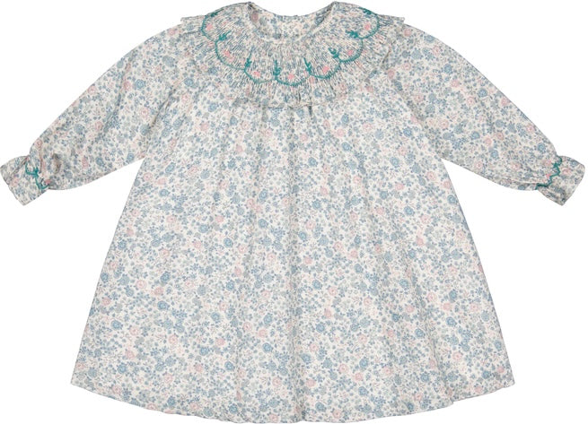 - Smocking: The Bishop Cut design features a beautifully smocked collar adorned with delicate green and pink floral embroidery.