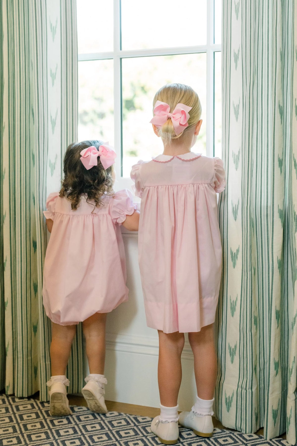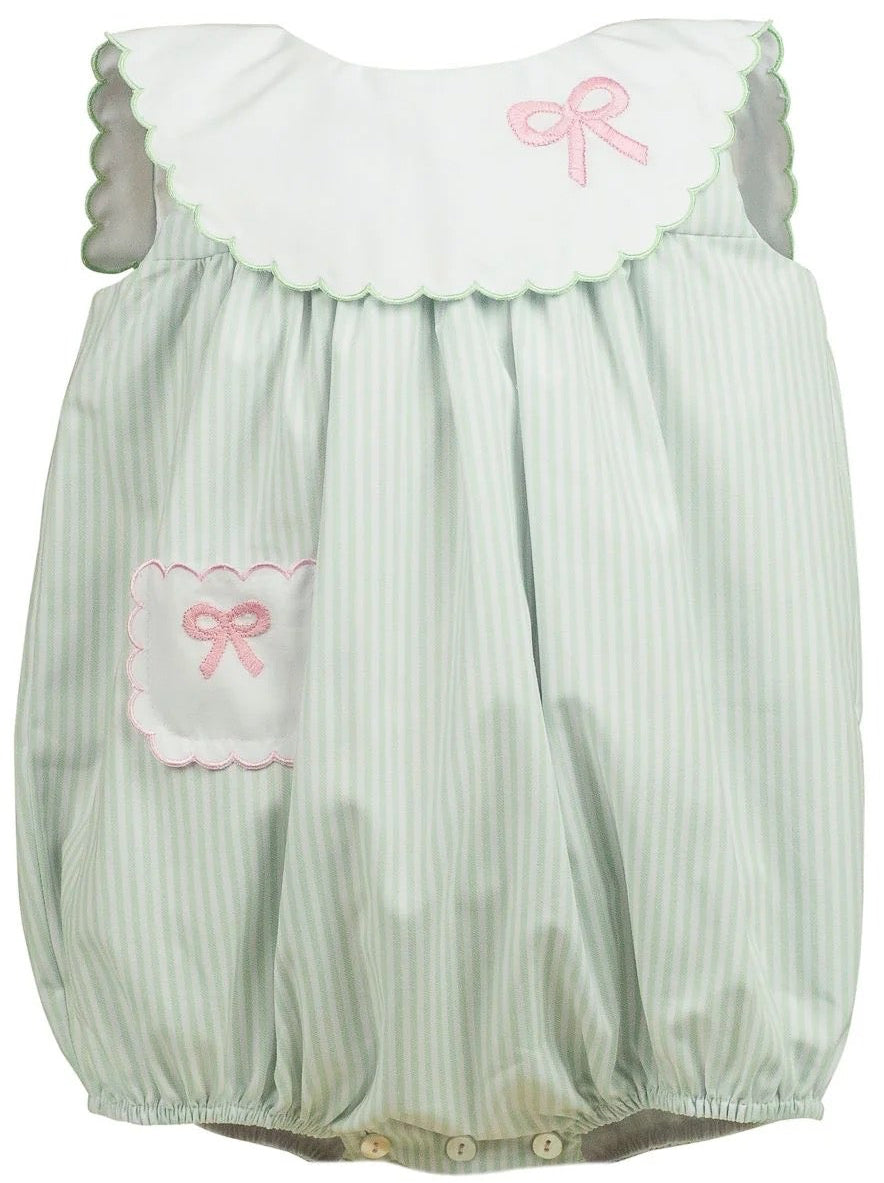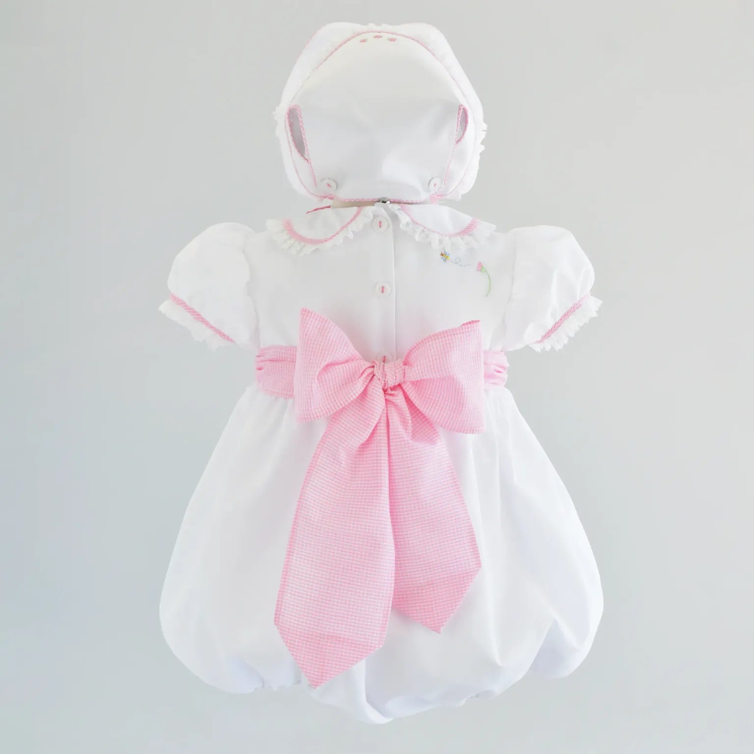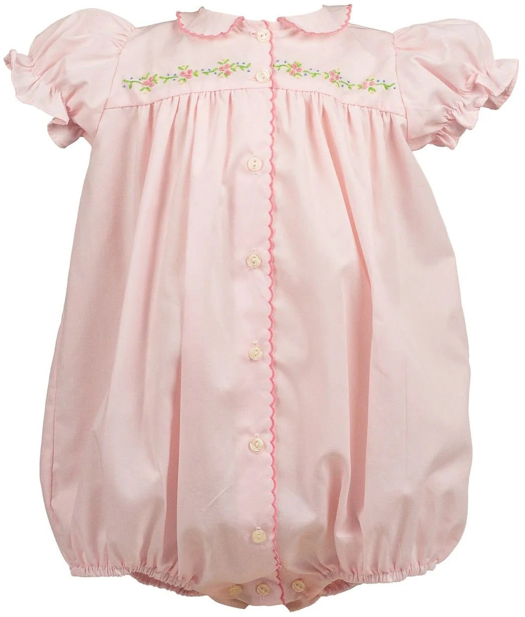 Regular price $74.00Pretty, playful, and perfect for every occasion, the Ruth Ribbon Bubble is designed with both charm and versatility in mind. Made in our soft Classic Pink Windowpane, this bubble features a crisp white Peter Pan collar and your choice of delicate ribbon embroidery—bows, hearts, or bunnies—to suit any moment.