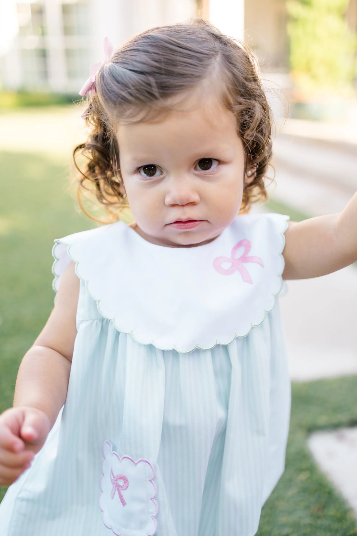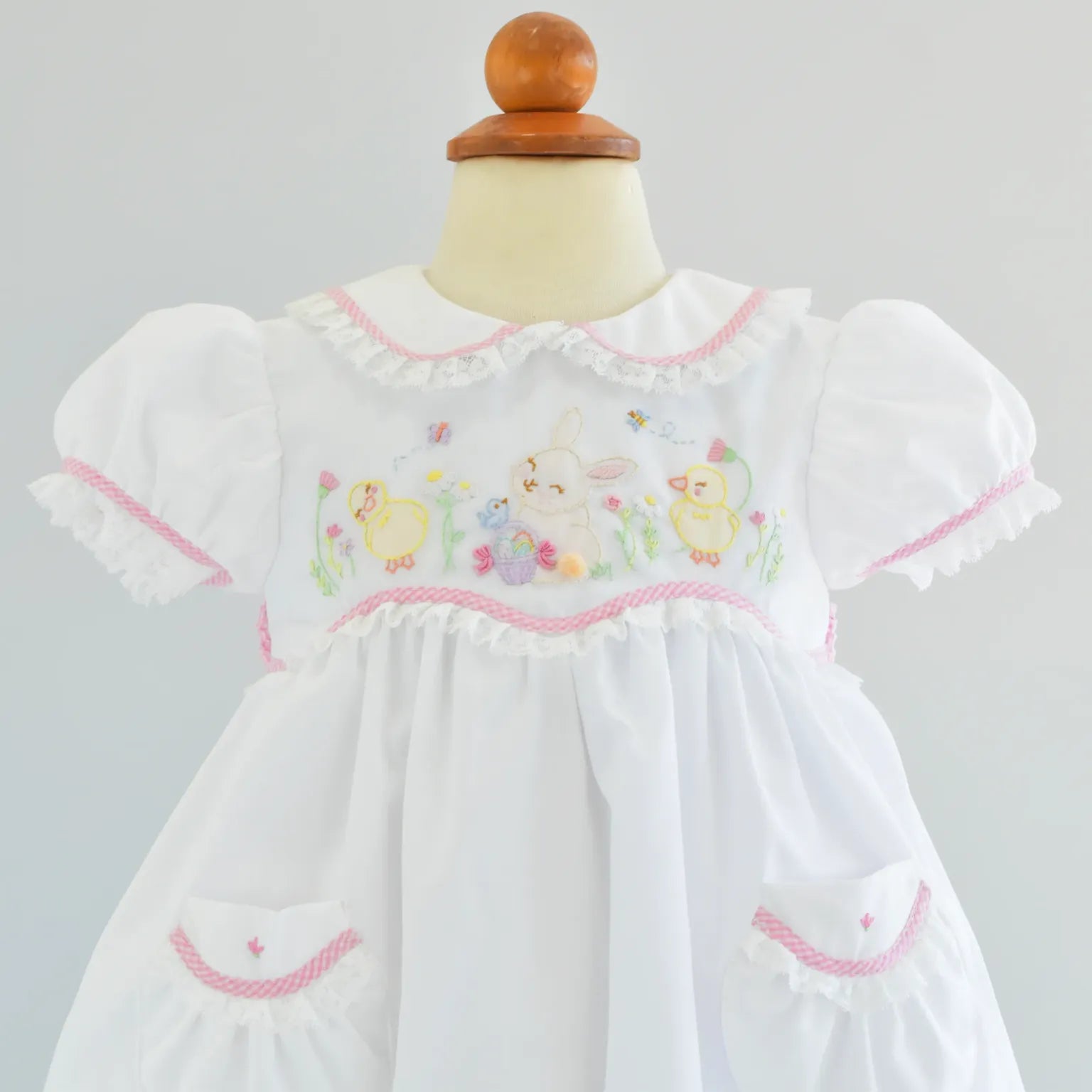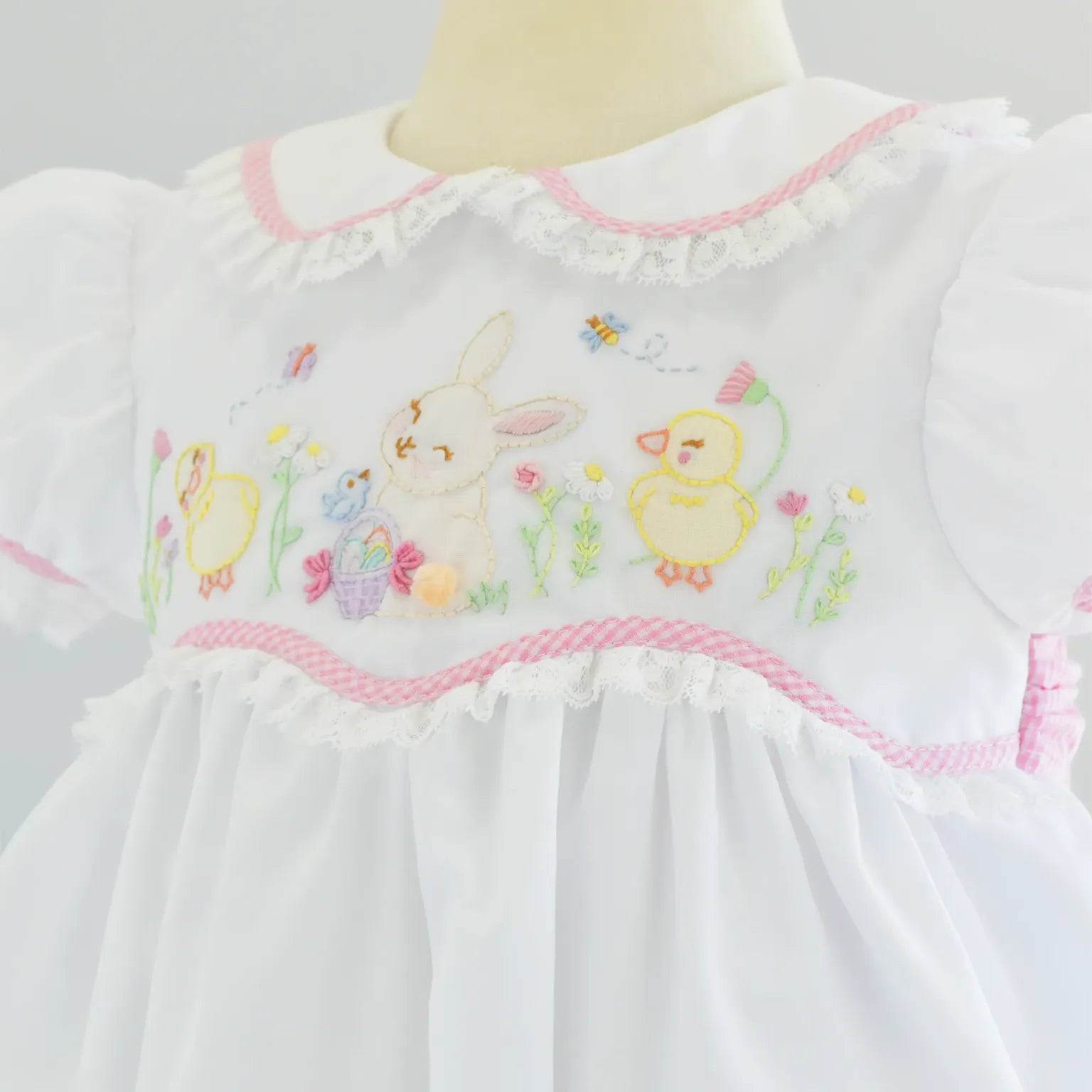 Regular price $74.00Pretty, playful, and perfect for every occasion, the Ruth Ribbon Bubble is designed with both charm and versatility in mind. Made in our soft Classic Pink Windowpane, this bubble features a crisp white Peter Pan collar and your choice of delicate ribbon embroidery—bows, hearts, or bunnies—to suit any moment.